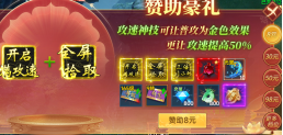 4.进入游戏后建议先购买【8元赞助】送【满攻速、全屏拾取】,【30元赞助】送【神将继承100%】,输出效率翻倍!