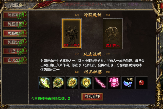 这里面有两个BOSS,一个是远古神魔的守护者,另一个是半兽人一族的首领,它们每天都会在山庄捣乱,被击杀30分钟后又会再次现身,分身的刷新时间是本体的三分之一。