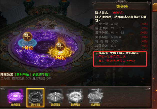 需要注意不同的阵法对武将的数量和质量有不同的要求哦,某些特定的阵眼位置还会有额外的属性加成。