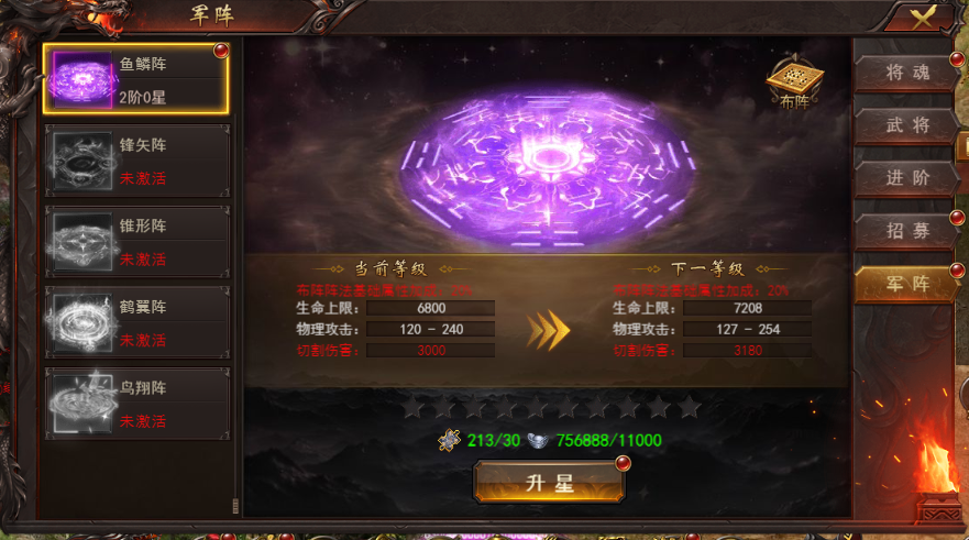 开启三国大陆后,点击将魂一军阵界面,我们便能看到目前在三国大陆上已经开放的五种军阵:鱼鳞阵、锋矢阵、锥形阵、鹤翼阵以及鸟翔车。